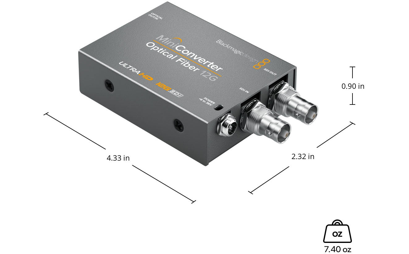 Mini Converter Optical Fiber 12G converts SDI to optical fiber and optical fiber to SDI in both directions at the same time, you can even have different video standards going in each direction! The 12G‑SDI connections are multi rate, which makes it compatible with all SD, HD and Ultra HD formats and equipment up to 2160p60, including Level A and B devices. You can install any standard 3G, 6G or 12G‑SDI SFP optical fiber module so you can send SDI using the same low cost optical fiber cables that are commonly used for computer networks.