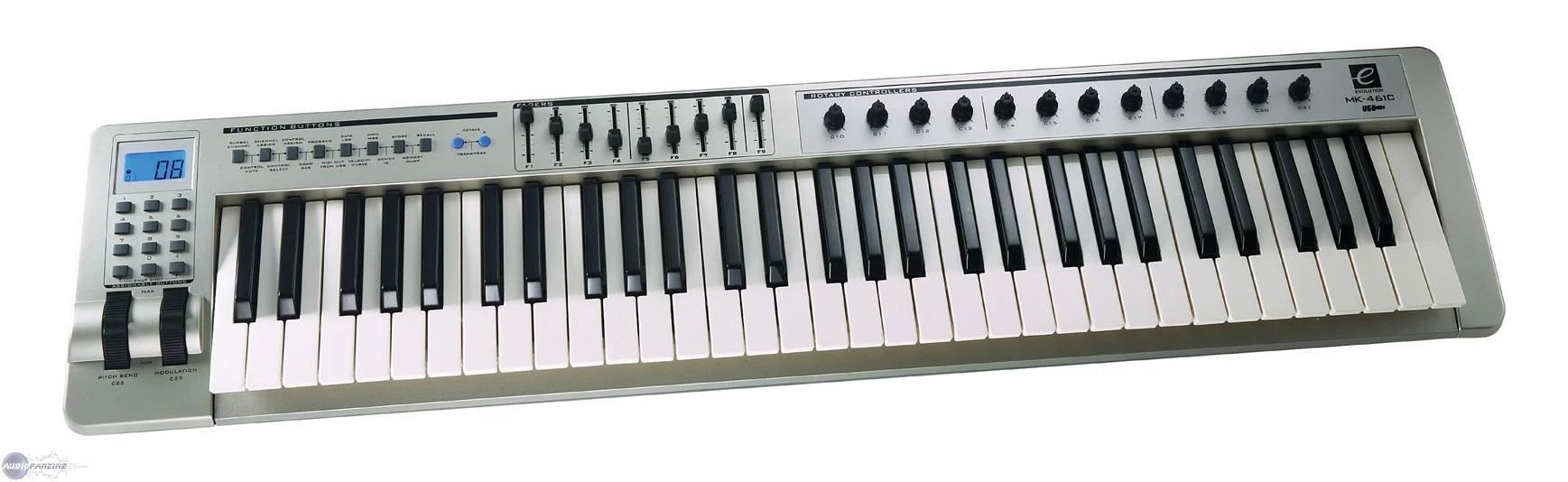 More Control Just about everything onthe Evolution MK-461C is an assignable controller-including knobs, faders, buttons, pitch wheel, mod wheel, and sustain pedal input. You can even trigger specific MIDI notes from assigned buttons. More Playability One touch of the MK-461C's smooth, solid action will tell you that Evolution hasn't forgotten that keyboards are also meant to be played. 12 different velocity curves let you choose the response that's perfect for your touch. The MK-461C's slide controls are high-quality Alps faders. More Performance/Programming Features Program while you play using the MK-461C's unique keypad entry method-complete with dedicated function buttons, inc/dec controls and 10 memory presets. Organ Drawbar mode reverses the faders to respond just like the real thing. Controller Mute allows you to preadjust controller positions without sending data, then use Snapshot to send all current settings at once. More Intuitive The Evolution MK-461C controller is USB class compliant, making installation as simple as plug-and-play.The MK-461C's large LCD panels provide for words and graphics that numeric displays alone can't touch. You also get presets set up to control popular music software right out of the box. More Value Note for note, all this adds up to more features for the dollar. All Evolution keyboards even come bundled with free software to get you started-including a VST sequencer for PC. Evolution MK-461C Compatibility: