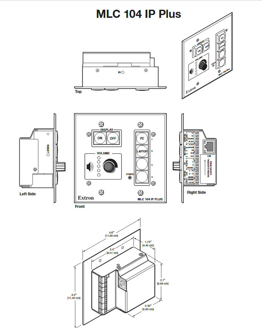 MLC 104 IP Plus DV+ device  2.70" H x 3.38" W x 1.80" D (69 mm H x 86 mm W x 46 mm D) and