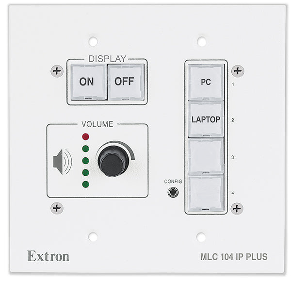 The Extron MLC 104 IP Plus MediaLink Controller with built-in IP Link® Ethernet Control is an easy-to-use control panel for any small classroom or meeting room. It is designed to control a wide range of smaller AV systems and enables Web-based remote diagnostics, AV resource management, and support. The MLC 104 IP Plus standardizes the control interface for all systems, making display systems simple to use. Standardization also makes setup and maintenance easier to support.