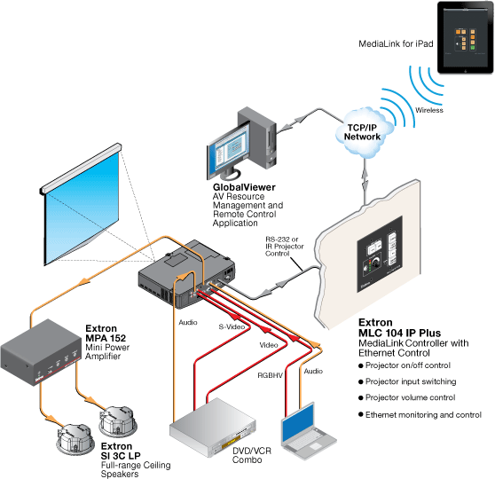 The MLC 104 IP Plus is equipped with Ethernet control and is designed to work in conjunction with GlobalViewer, Extron's Web-based AV resource management and remote control application. Together, these form a powerful control solution with the following features: