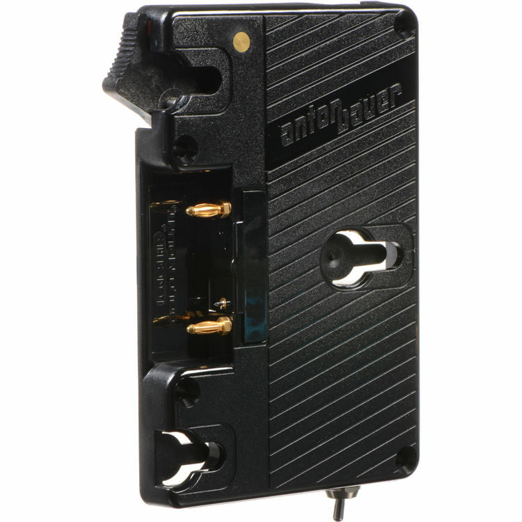 The QR-JVC Digi is an OEM bracket supplied with the camera, Connections are made through a 2 pin Molex for power and a 3 pin Hirose for Gold Mount protocal. This bracket has one Power Tap with a 7 amp internal fuse, and our Automatique Circuit/Switch to control on camera lights with record/pause to save battery run time. When the Automatique is in the off position the Power Tap is always active, when Automatique is turned on the power tap is active only when camera is recording, on Pause the light turns off.