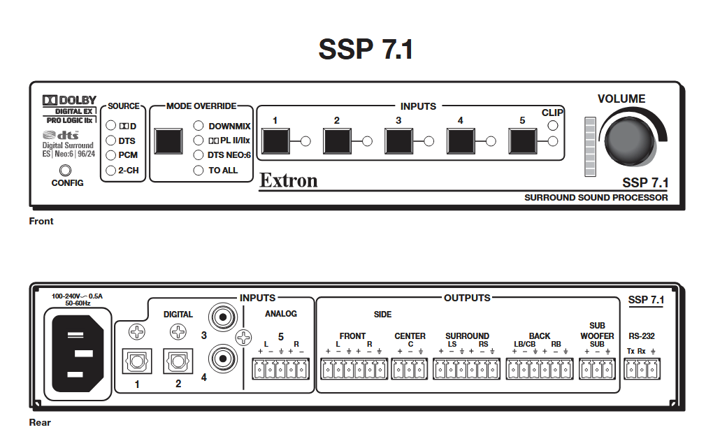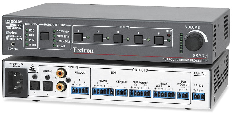 The Extron SSP 7.1 five input Surround Sound Processor provides up to eight channels of surround sound for pro AV applications in corporate and commercial environments. The SSP 7.1 automatically detects and decodes audio content in various Dolby® and DTS® formats from DVD, Blu-ray Disc, and HDTV broadcasts. It also offers Dolby Pro Logic II/IIx and DTS Neo:6® processing to provide surround sound from two-channel stereo. The SSP 7.1 features coaxial and optical digital inputs, plus an analog balanced/unbalanced two-channel input. It is designed for integration into pro AV installations, with a compact, rack-mountable metal enclosure, RS-232 serial control, and balanced/unbalanced line level outputs. The included control software offers a user-friendly GUI for setup and operation.