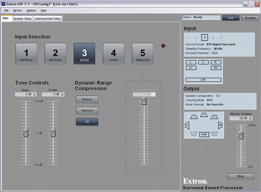 • Live and Emulate operation modes with configuration file saving — Allows settings to be configured offline, then uploaded to the SSP 7.1. The software also downloads configuration files from the processor for archiving.