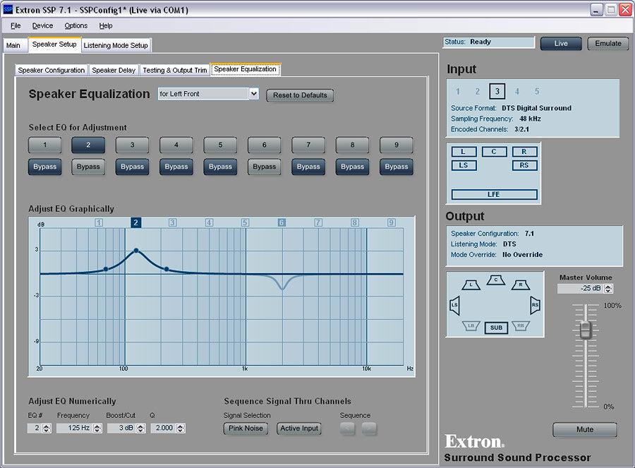 The SSP Setup and Control Software features an intuitive user interface for efficient setup and control of the SSP 7.1 as well as calibration of the sound system. Using the software, an integrator can specify the number and size of all speakers in the system, and enter the distance of each speaker from the central listening position, or location where acoustical measurements are taken. A nine-band parametric EQ is available for each of the satellite speaker channels to tailor the output signal to the acoustical environment.