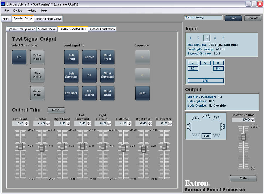 The SSP 7.1 generates test signals including Dolby noise and full-bandwidth pink noise that can be routed sequentially to each speaker, or directed selectively to any speaker using the software. Dolby noise is a band-limited pink noise that allows for higher sound pressure levels, which is advantageous when calibrating speaker outputs to equal SPLs. An individual trim level is provided for each channel to facilitate calibration. The pink noise test signals can be used to calibrate a speaker’s interaction with the acoustical environment. The SSP 7.1 also offers the option to use an external source for test signals, which can then be directed to any speaker, or all speakers in sequence.